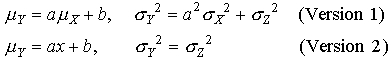 (P0) Identifikation: Lineare Regression: Schätzen von a, b und V(Z) aus einer Stichprobe (X1,Y1),..,(Xn,Yn) bzw. (x1,Y1),..,(xn,Yn); vgl. multivariates nichtlineares Modell (S0011), Optimierung (P4), geschlossene Lösung (M1) (P1) Enumeration: Ermittlung der (bedingten) Verteilung von Y zu gegebener Verteilung von X bzw. zu gegebenem x. Normalverteilung:Bei Version 1 ist die Einflußgröße X zufällig. Zielsuche und Inversion beziehen sich auf die Ermittlung dieser Zufallsgröße. Dies ist ein Rückschlußproblem. Eine angemessene Lösung besteht darin, mit Hilfe der Bayesschen Formel die Posterior-Verteilung zu ermitteln.(P2/P3) Zielsuche/Inversion: Ermittlung von x0 zu vorgegebenem Y=y0 (Version 1) Rückschluß: Posterior-Verteilung (Version 2) Planung: Likelihood-Funktion
