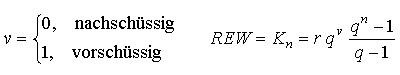 Die Auflösung nach q ist i.a. nicht durch Angabe einer geschlossenen Formel möglich. Das Problem der Effektivzinsberechnung besteht gerade darin, den Wert q so zu wählen, daß zu vorgegebenen Werten für die Rate r und die Laufzeit n ein ebenfalls vorgegebener Sollwert REW erzielt wird.